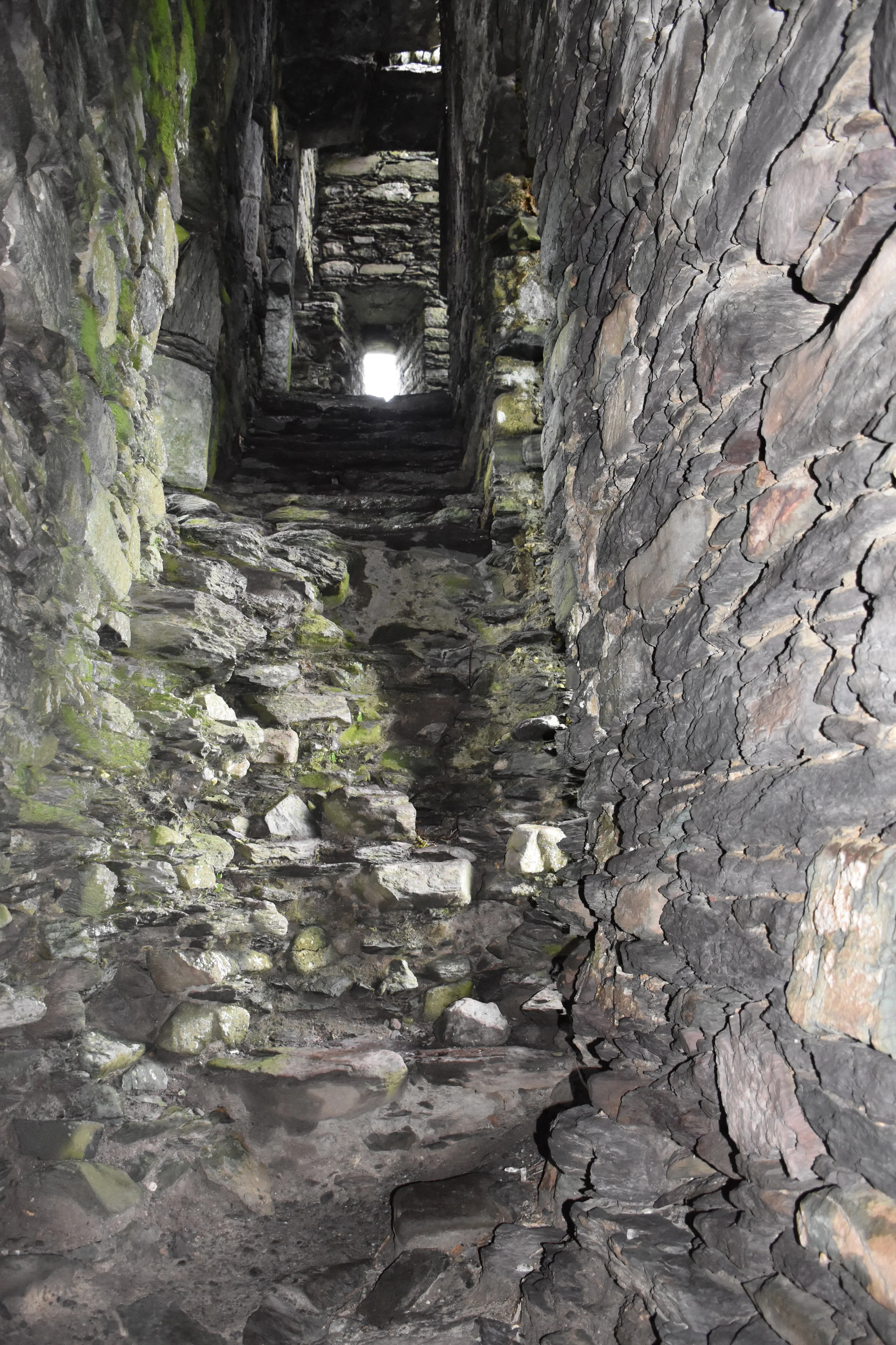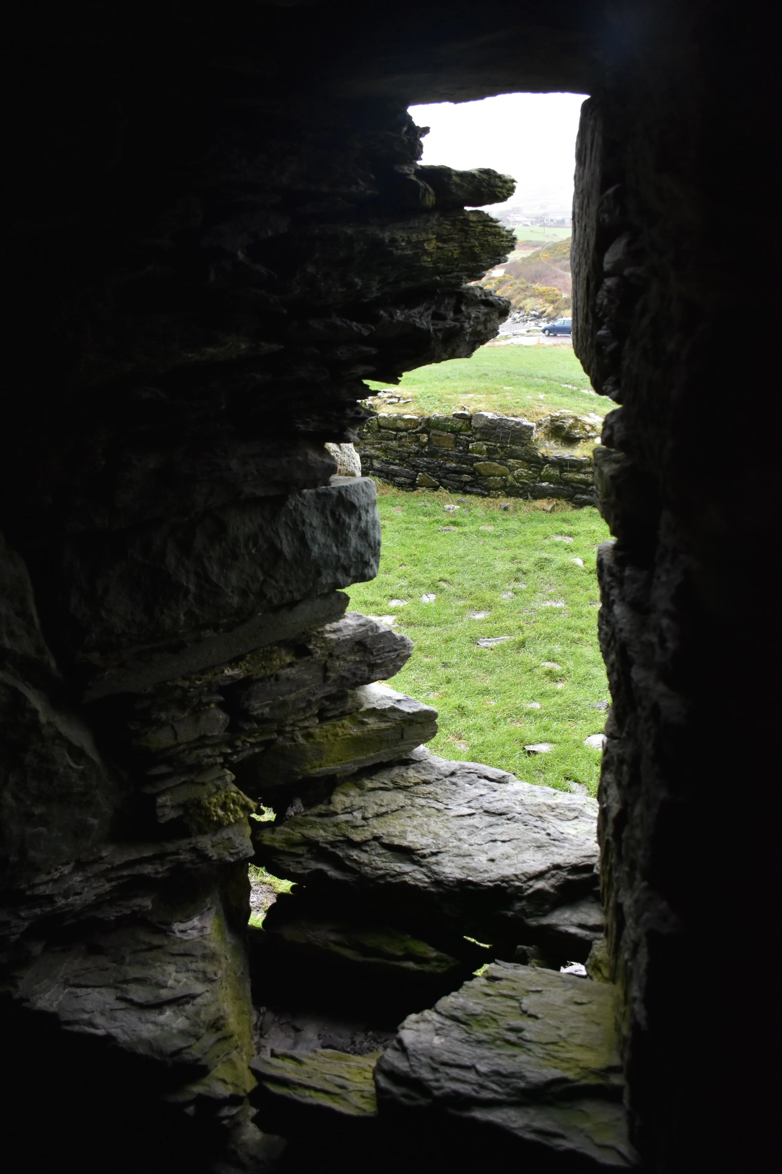When I opened my eyes I suddenly felt nervous. There were stones strewn about that were once part of the walls. So I made my way out and walked around outside. A half wall was left standing. It was embedded with fireplaces and encircles the castle on the inland side. Turning around I spotted a jagged hole that led into the right hand section. Sheep prints everywhere and that smell was stronger inside. I was too nervous to step fully in but I took a good look around from the "doorway".