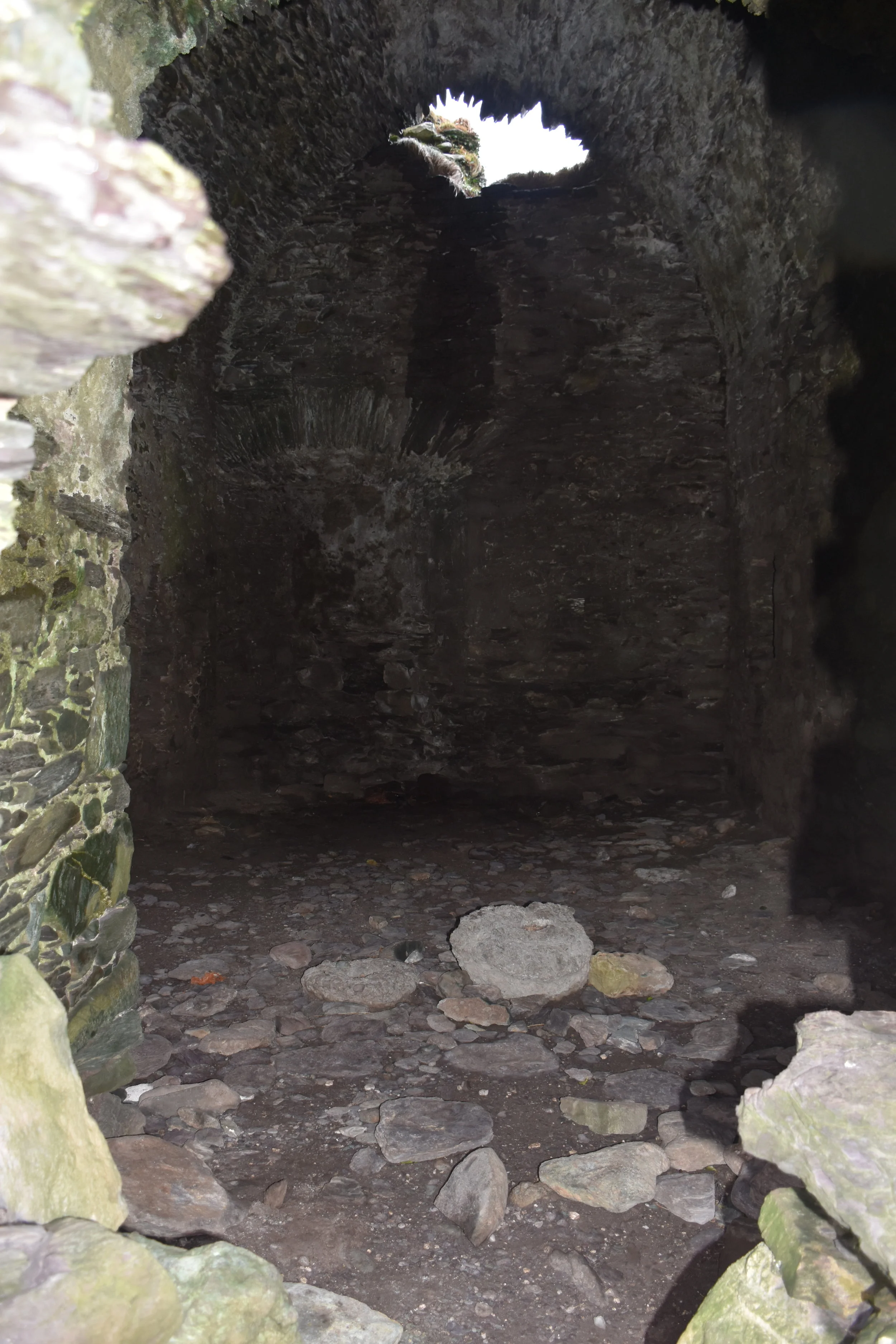 The entire right side is covered in a dark green vine. In places that might have been the only thing holding it together. But I went in anyway. Once inside I stood in front of huge openings with sweeping views of the area. Weird little nooks at various heights in the walls made me curious. They must have been where timber was inserted for flooring and roofing.
